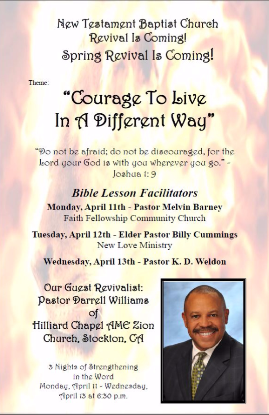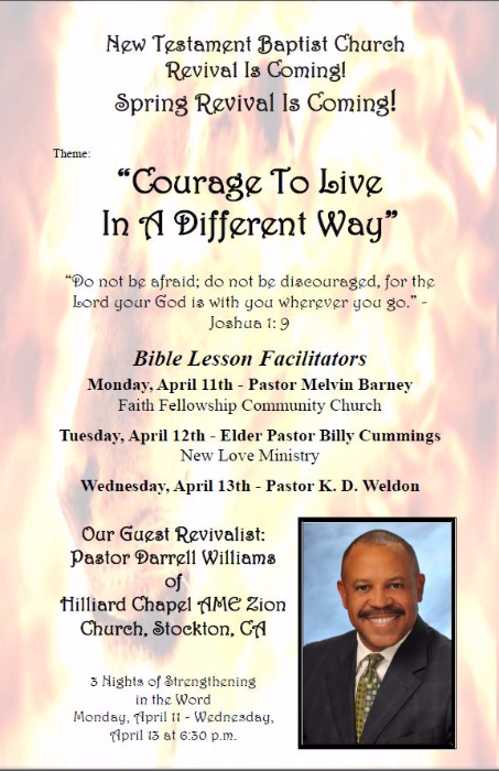 Elder Pastor Billy Cummings will be facilitating the Bible lesson on Tuesday, April 12th at New Testamant Baptist Church in North Highlands. We hope you will join us at 6:30 pm. See flyer below for details for NTBC's week of Spring Revival.