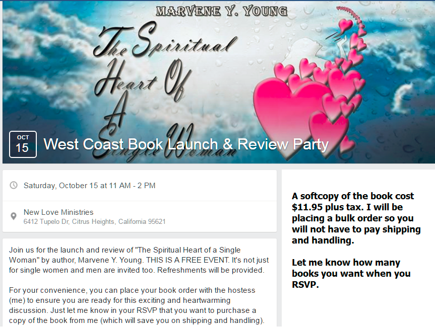 NLM will host the West Coast launch of Christian author, Marvene Y. Young's first book "The Spiritual Heart of a Single Woman". This event will be a book club-style book review, where the author will discuss her book and share practical approaches to living righteously as a single woman.
