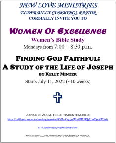 Join us online Monday evenings from 7 -8:30 PM, Pacific as we begin our FOLLOWING YOUR ASSIGNMENT IN FAITH series study with Finding God Faithful: A Study of the Life of Joseph by Kelly Minter.